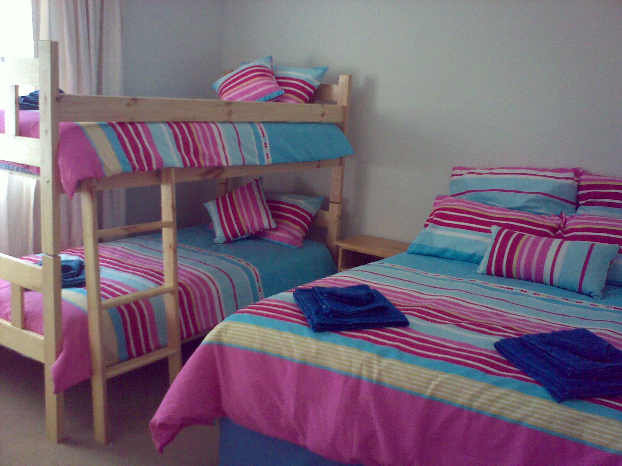 The unit comprises of two bedrooms with built-in cupboards, one full bathroom and an open plan lounge and kitchen area with granite tops. The main bedroom is fitted with a queen size extra length bed and night stands with reading lamps; the second bedroom consists of a double bed and a bunk bed (two beds on top of each other) with a night stand and reading lamp.