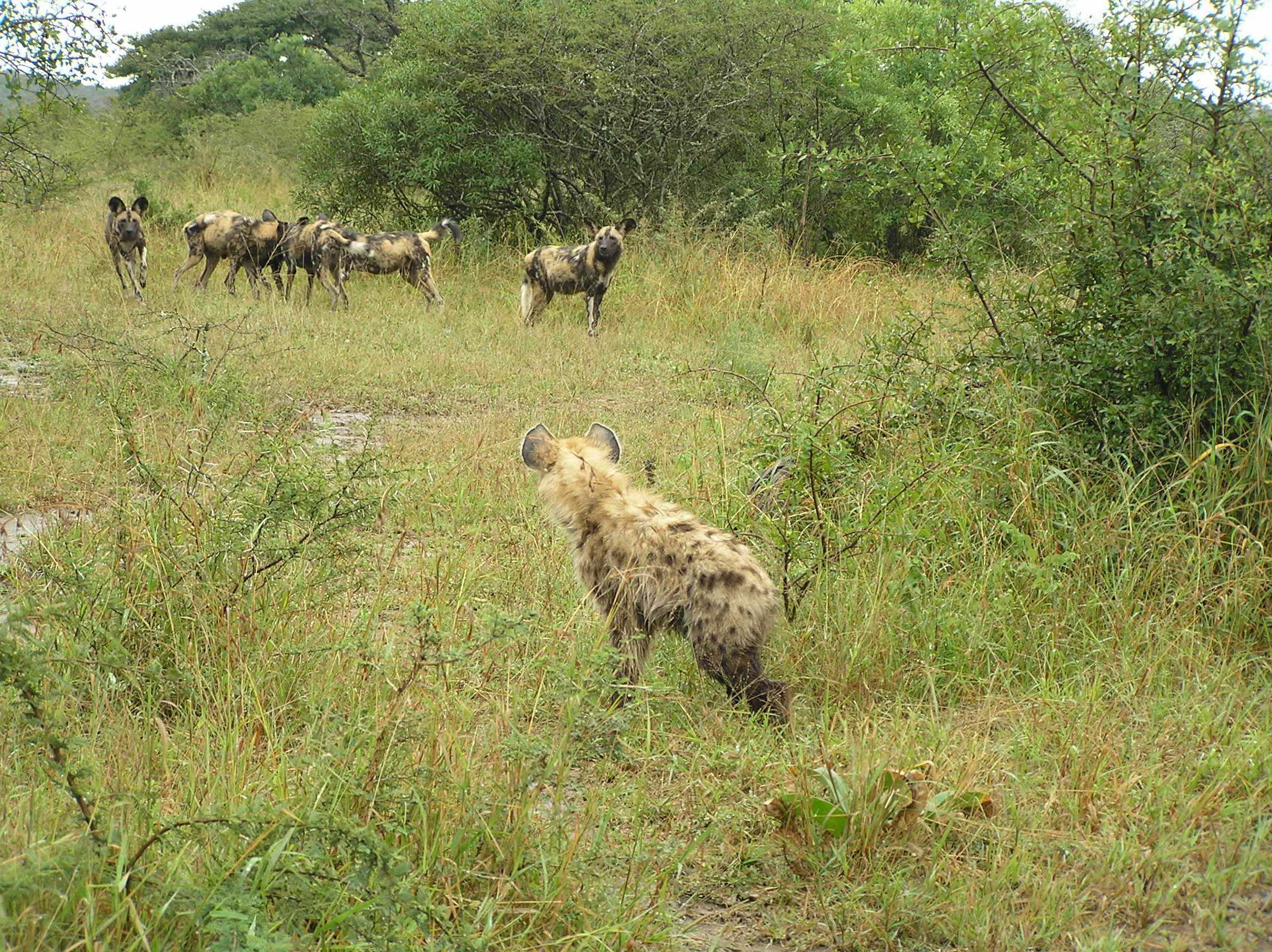 We could not believe our eyes when following close behind the hyaena came it's pup. Needless to say our cameras were clicking furiously as the saga unfolded . None of the animals appeared to be particularly perturbed by us. As the hyaena came close to the pack, the dogs split up and circled as their leader gave chase, as if this was a carefully rehearsed tactic was employed. This went on for some time as the animals repeated their stalk and chase games. This was the most exciting and thrilling scene as the tactic. I felt so privileged to have witnessed it. The dogs finally wondered off and the hyena and her pup quickly tried to retrieve the left overs.