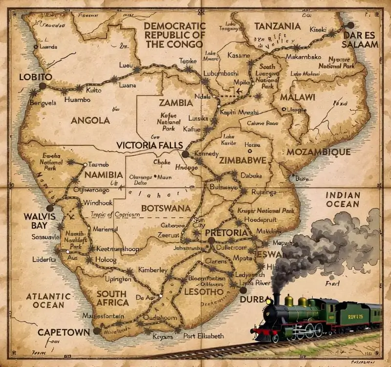 - Day 1: Departed Rovos Rail Station, Pretoria. The train was hauled by two locomotives (one steam and one diesel), the first being steam locomotive 3360 ‘Shaun’, built in 1948.